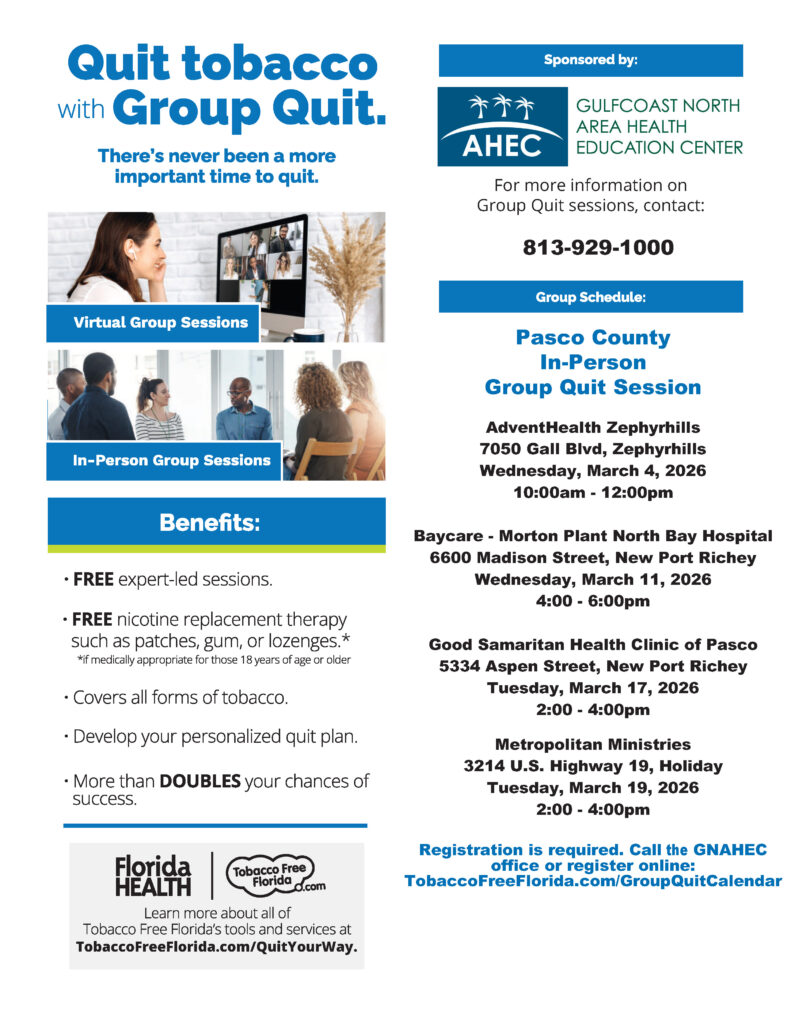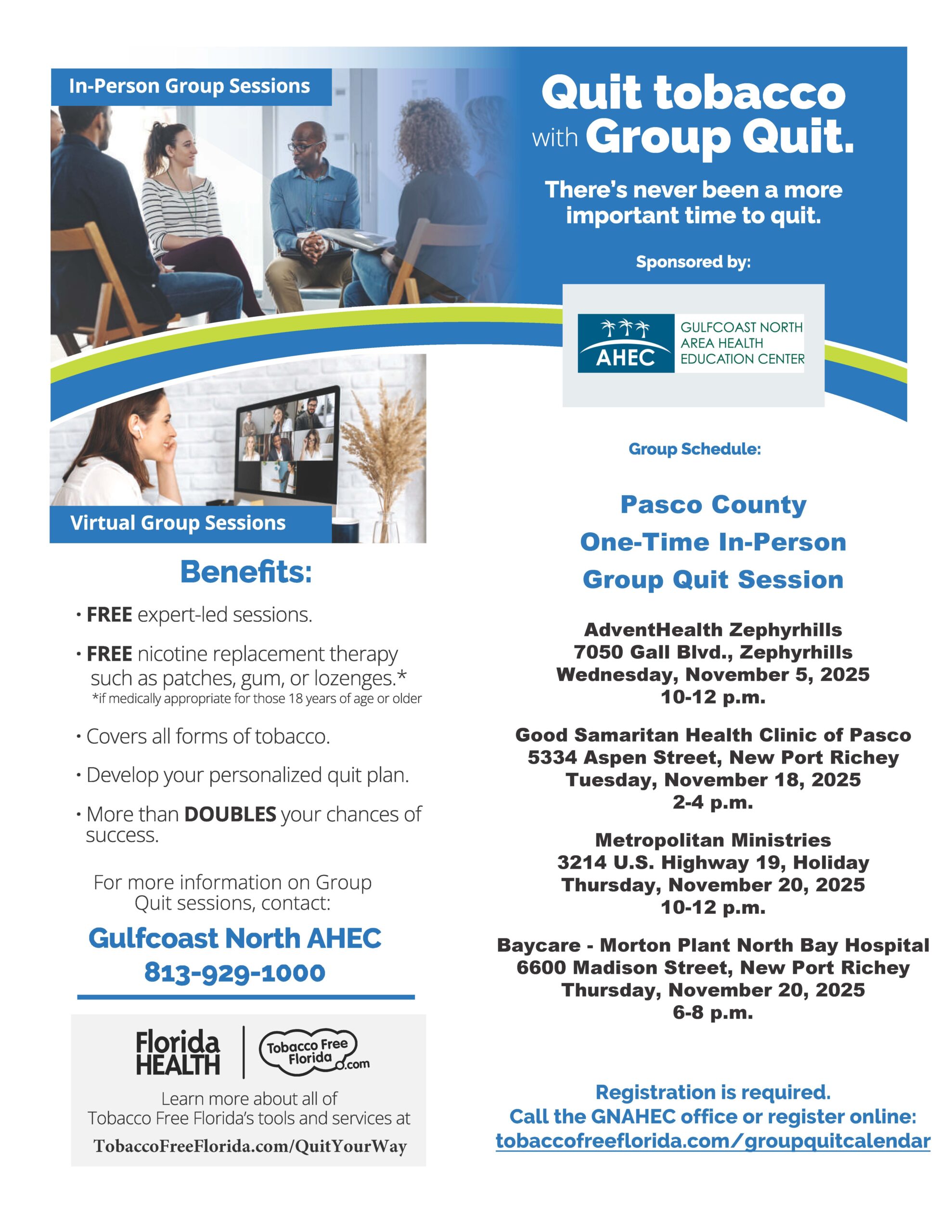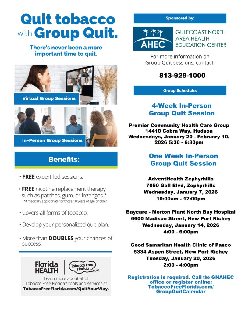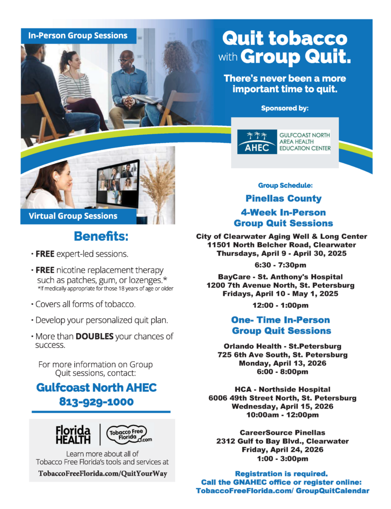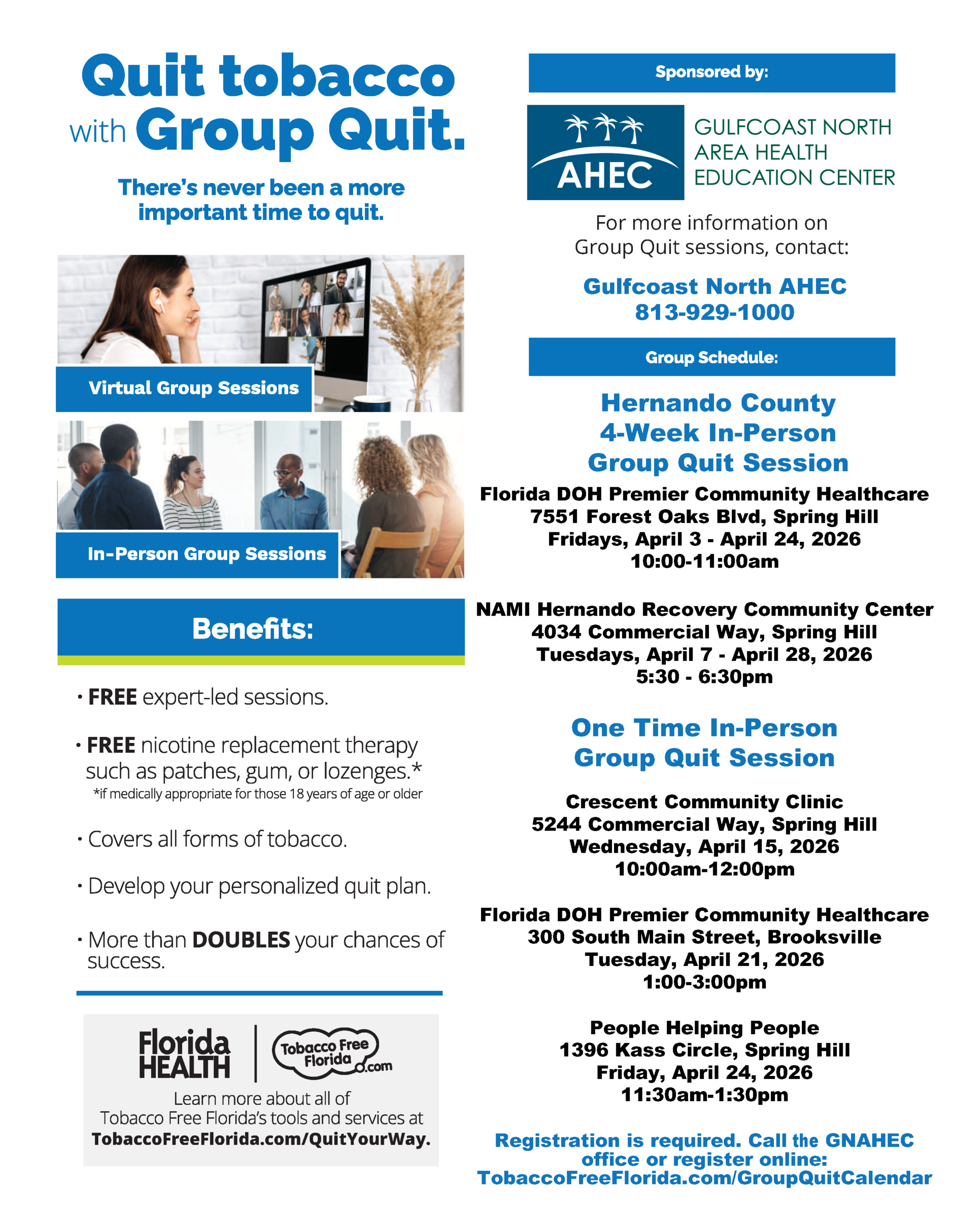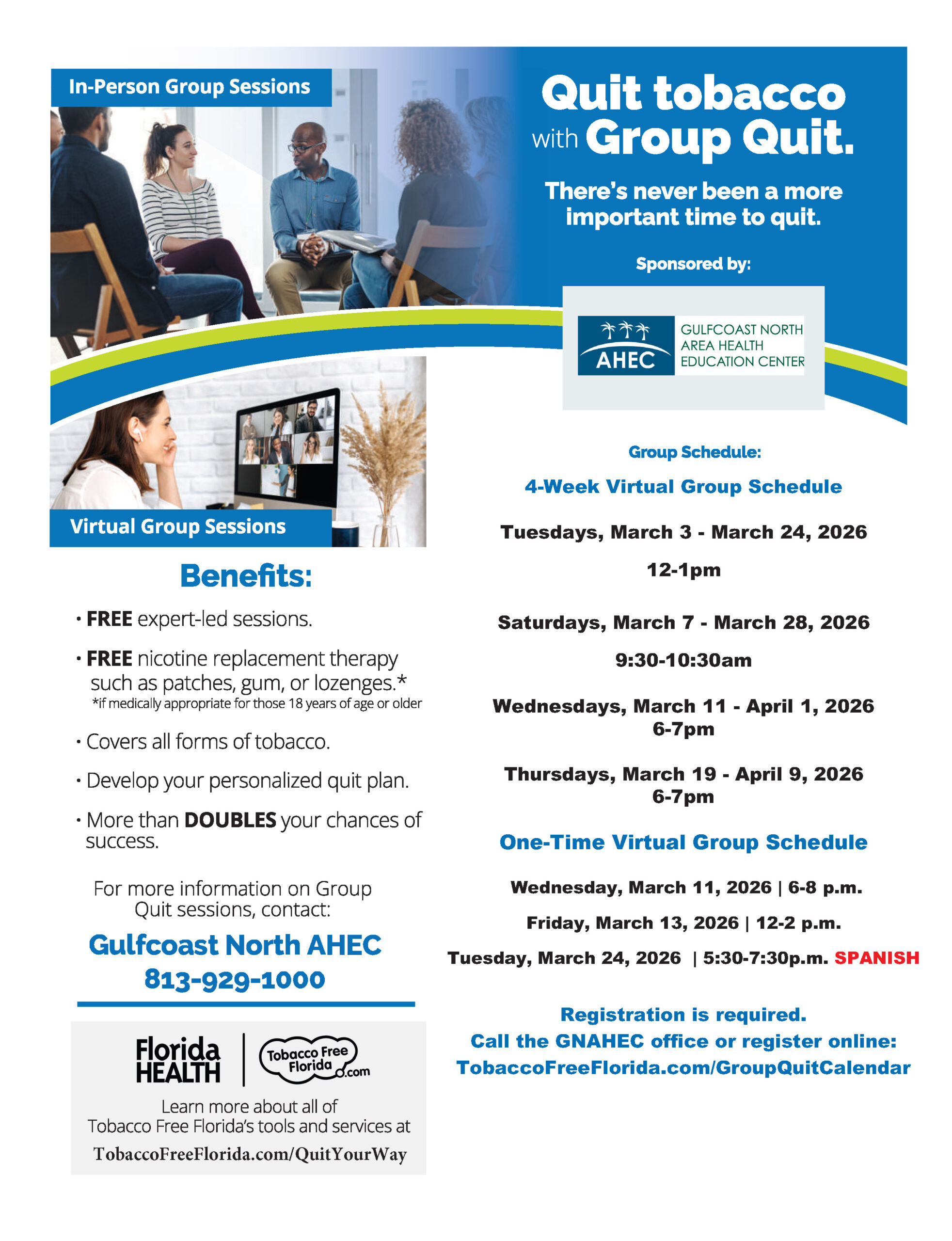 CONNECTING Students to Careers CONNECTING Professionals to Communities CONNECTING Communities to Better Health OUR PROGRAMS Tobacco Cessation AHEC Scholars Youth Programs Clinical Training Continuing Education Community Projects OUR PARTNERS WANT TO QUIT TOBACCO? Please see below for a calendar of available Tobacco Cessation Classes in your area: Group Quit Calendar DOWNLOAD OUR MONTHLY CLASS FLYERS Virtual Classes Spanish Classes In-Person - Hernando In-Person - Pinellas In-Person - Hillsborough In-Person - Pasco In-Person - Citrus CLICK HERE FOR MORE INFORMATION OR CALL US AT 813.929.1000
