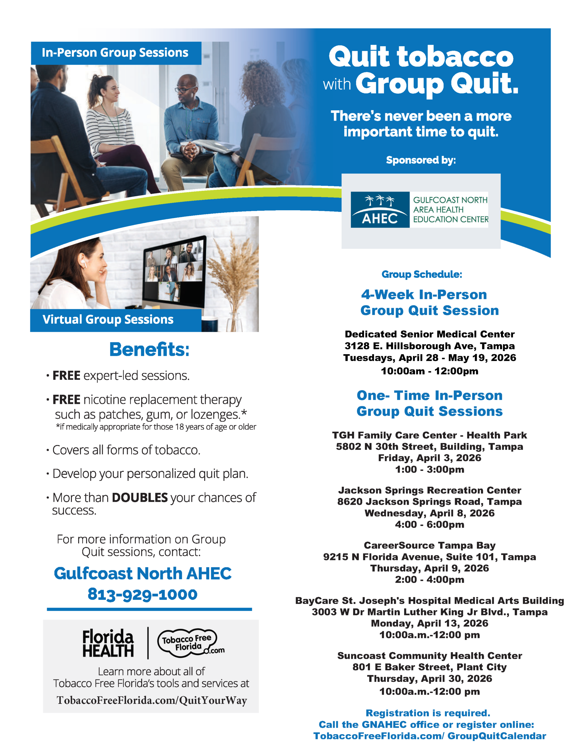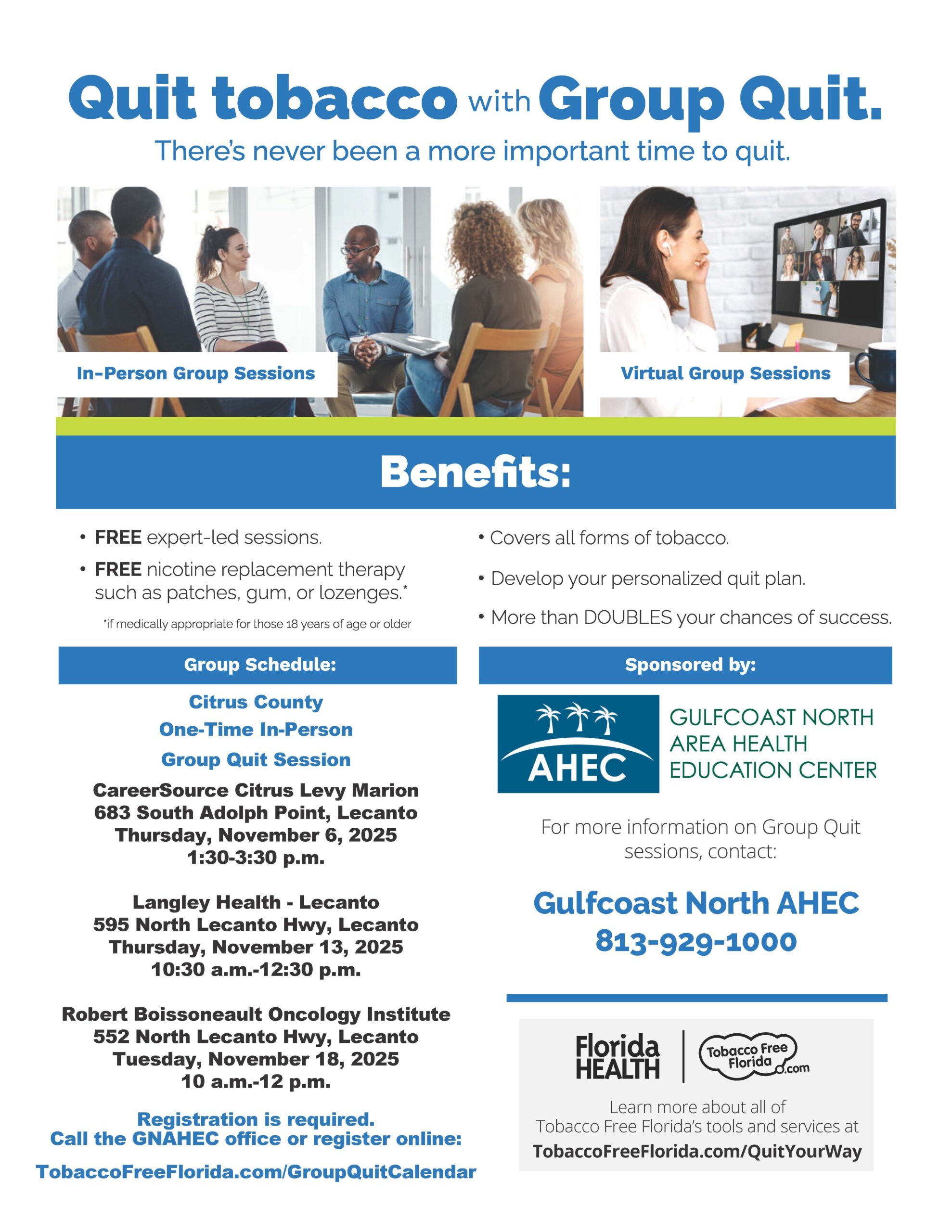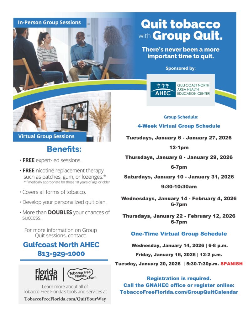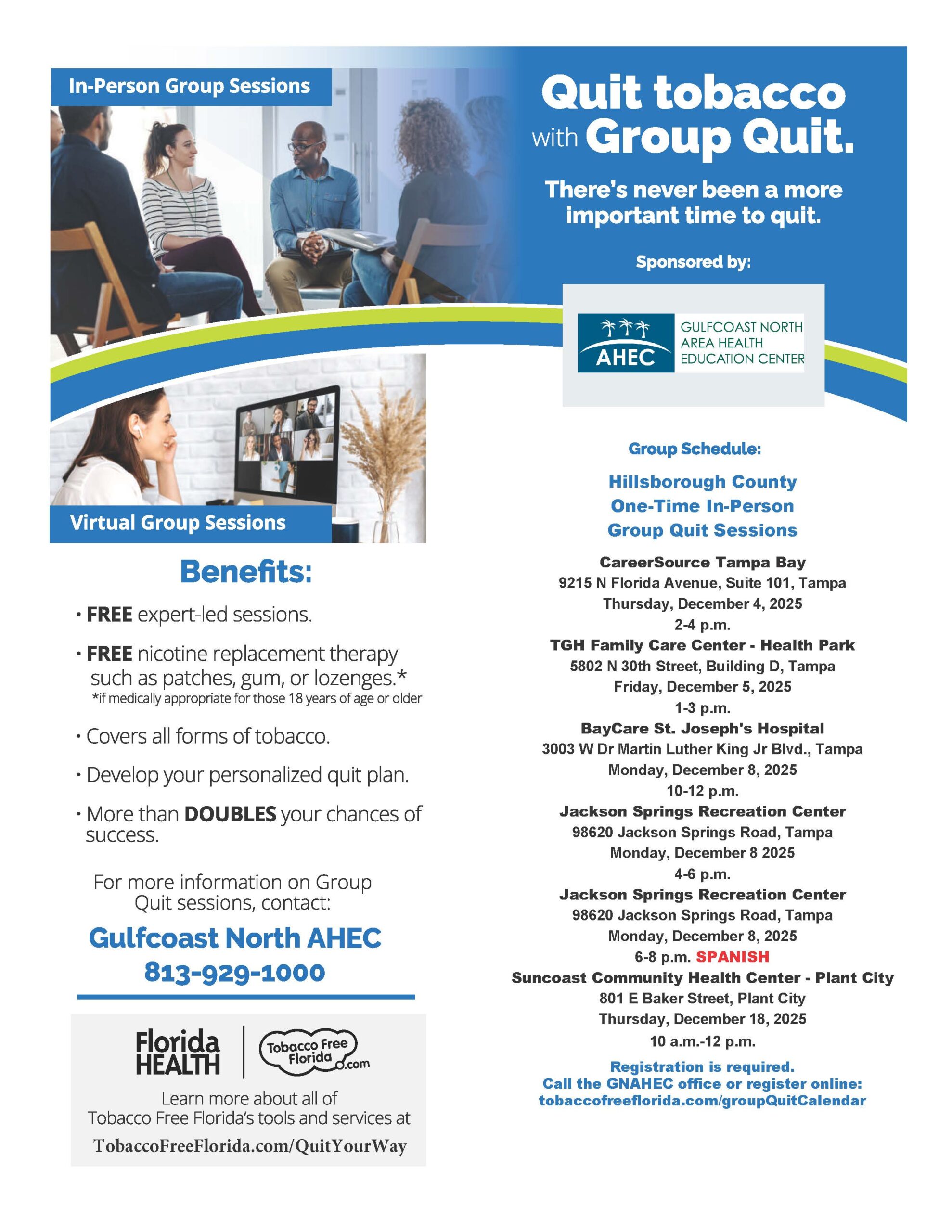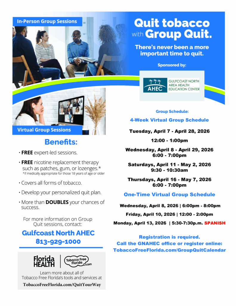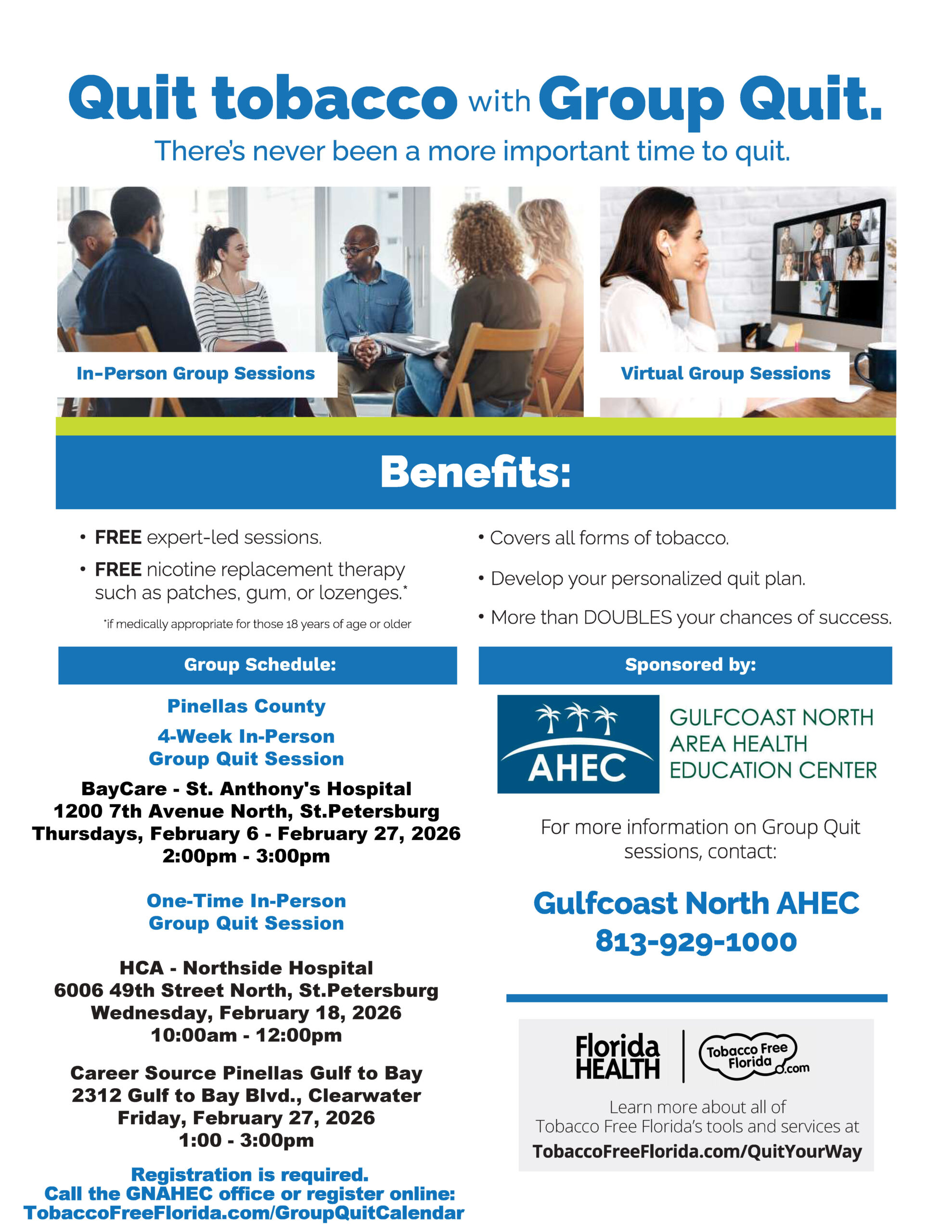 CONNECTING Students to Careers CONNECTING Professionals to Communities CONNECTING Communities to Better Health OUR PROGRAMS Tobacco Cessation AHEC Scholars Youth Programs Clinical Training Continuing Education Community Projects OUR PARTNERS WANT TO QUIT TOBACCO? Please see below for a calendar of available Tobacco Cessation Classes in your area: Group Quit Calendar DOWNLOAD OUR MONTHLY CLASS FLYERS Virtual Classes Spanish Classes In-Person - Hernando In-Person - Pinellas In-Person - Hillsborough In-Person - Pasco In-Person - Citrus CLICK HERE FOR MORE INFORMATION OR CALL US AT 813.929.1000