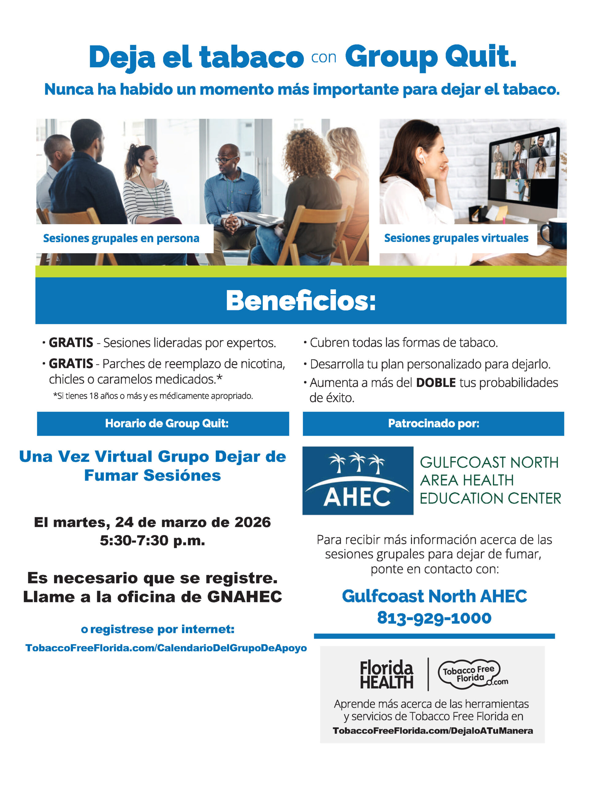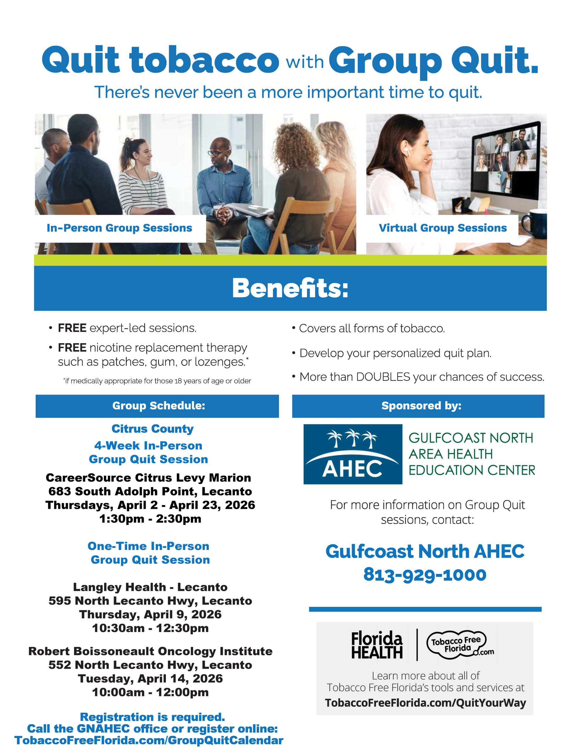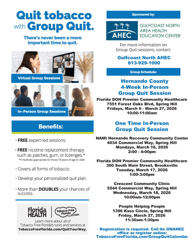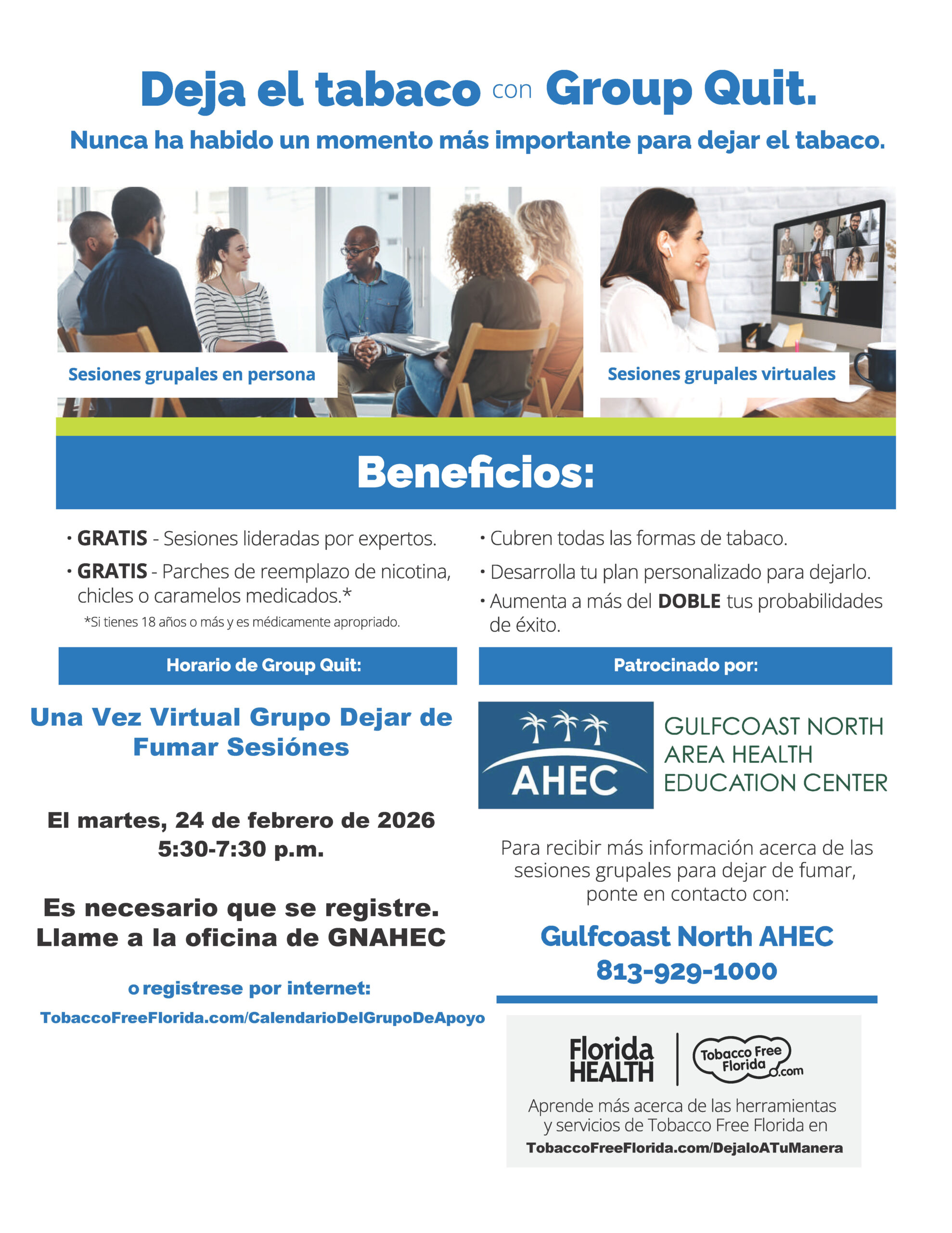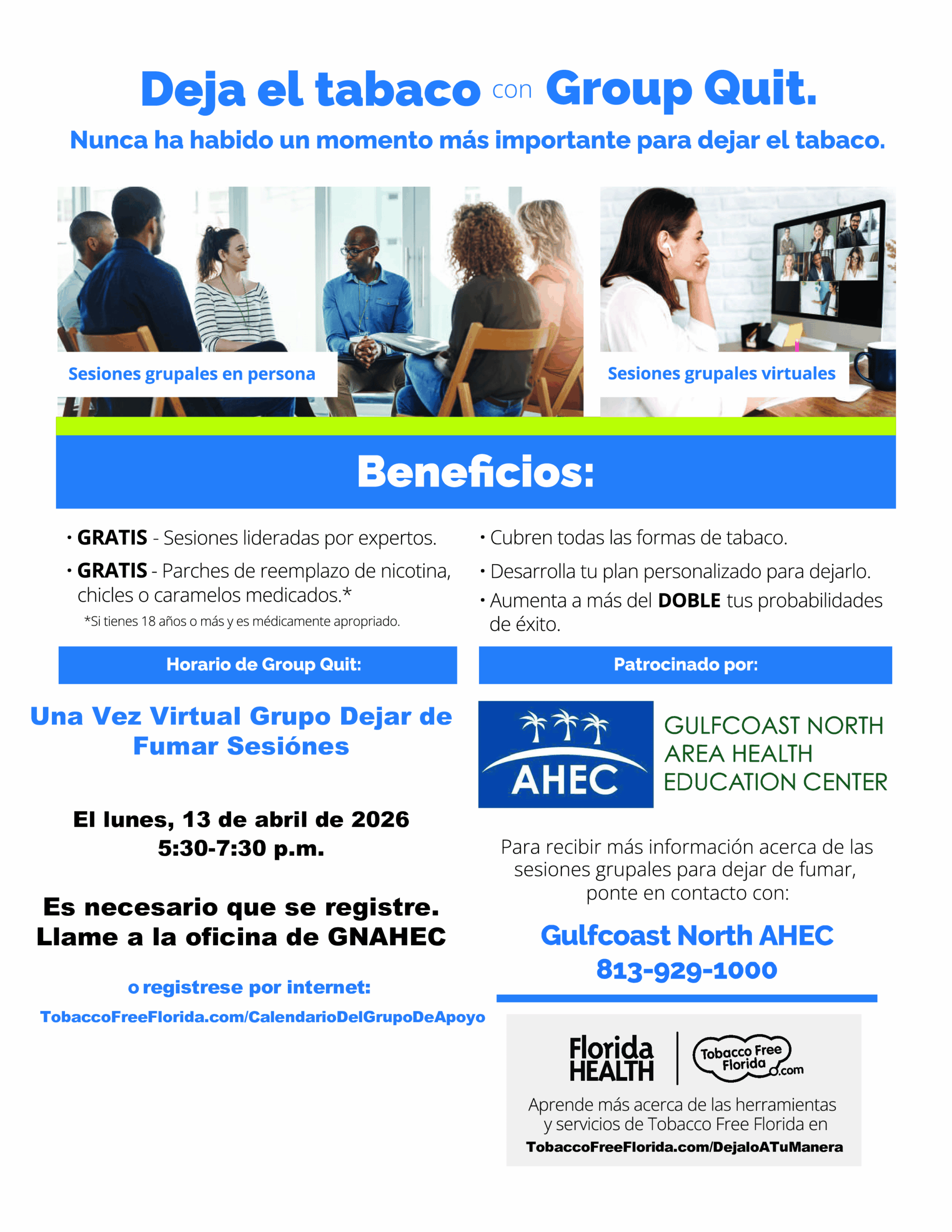 CONNECTING Students to Careers CONNECTING Professionals to Communities CONNECTING Communities to Better Health OUR PROGRAMS Tobacco Cessation AHEC Scholars Youth Programs Clinical Training Continuing Education Community Projects OUR PARTNERS WANT TO QUIT TOBACCO? Please see below for a calendar of available Tobacco Cessation Classes in your area: Group Quit Calendar DOWNLOAD OUR MONTHLY CLASS FLYERS Virtual Classes Spanish Classes In-Person - Hernando In-Person - Pinellas In-Person - Hillsborough In-Person - Pasco In-Person - Citrus CLICK HERE FOR MORE INFORMATION OR CALL US AT 813.929.1000