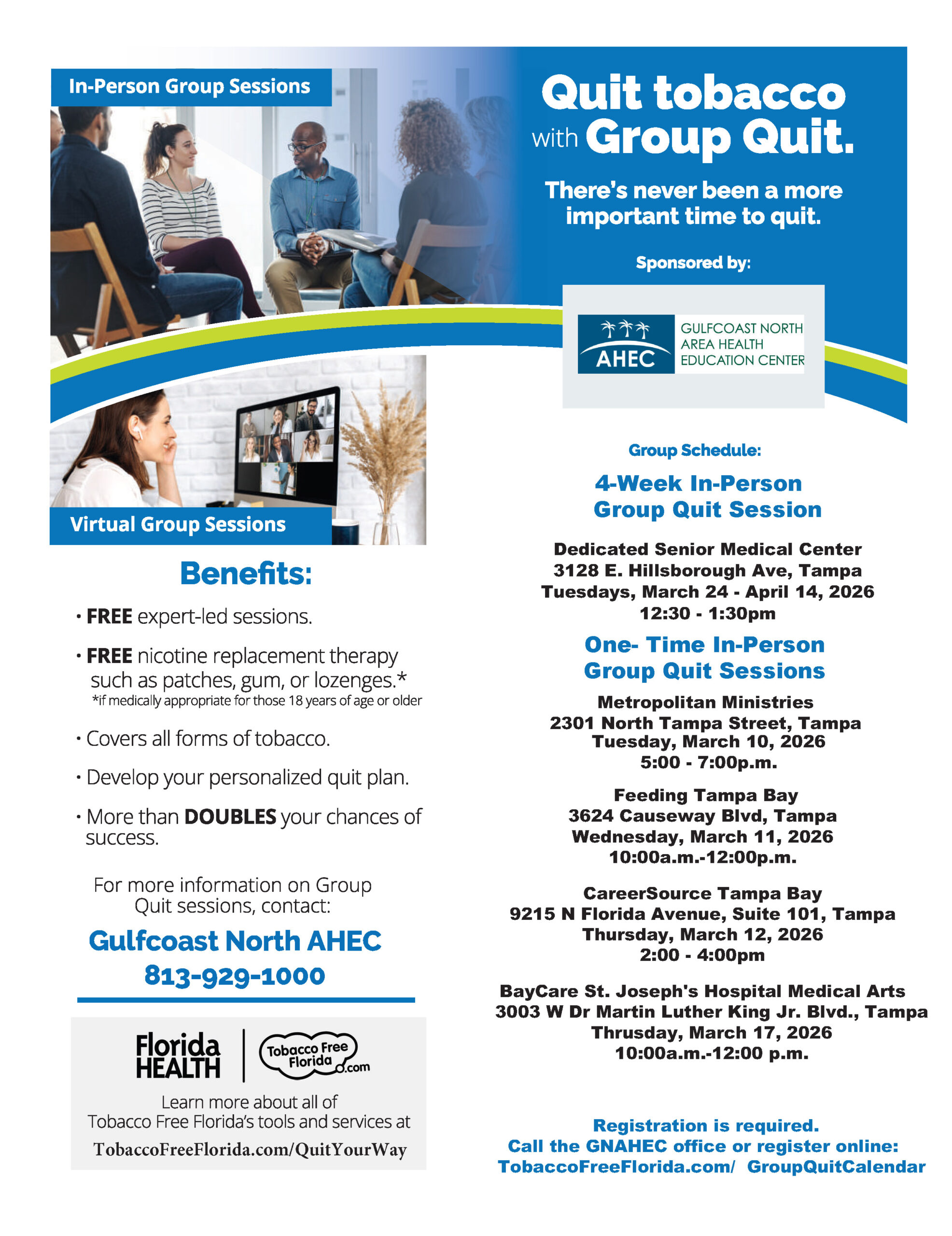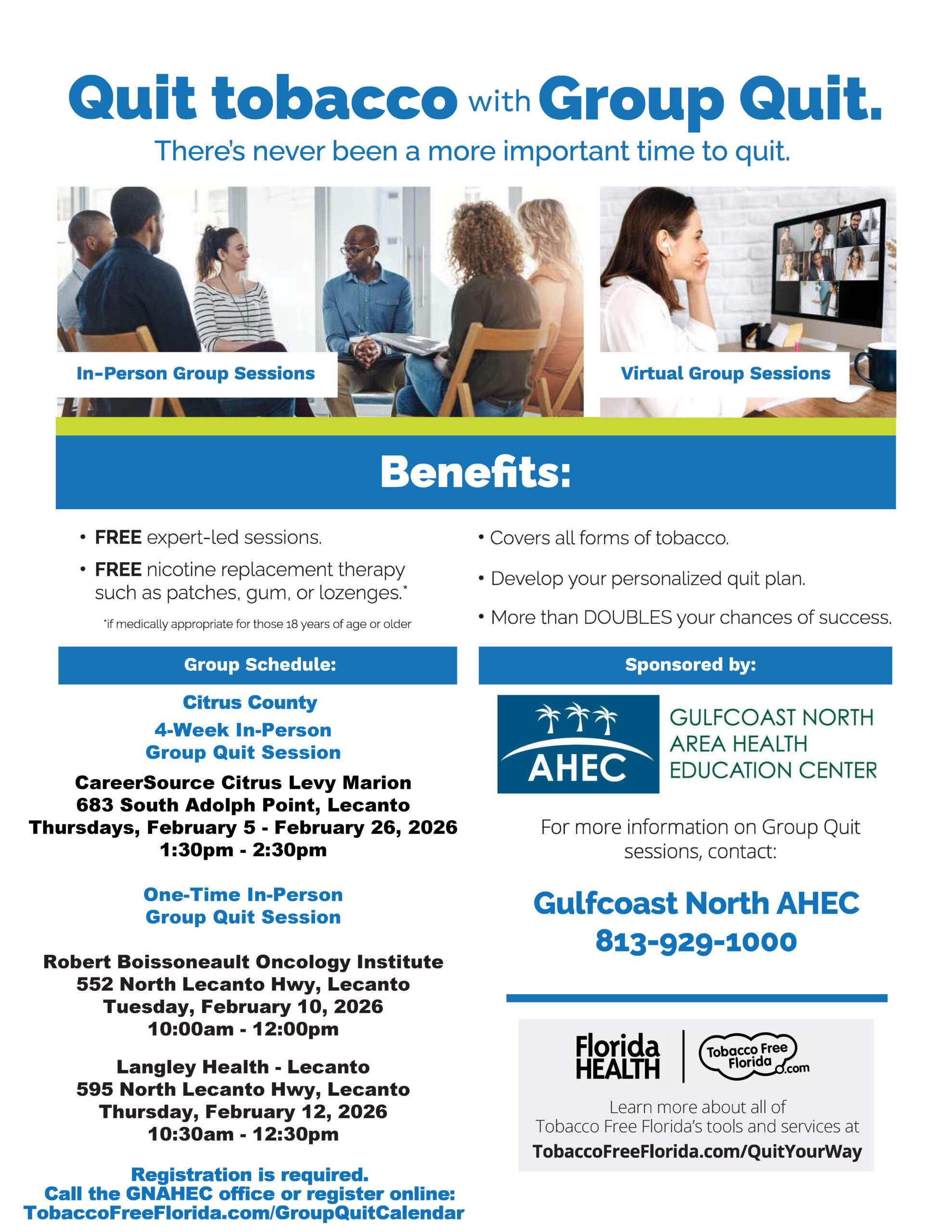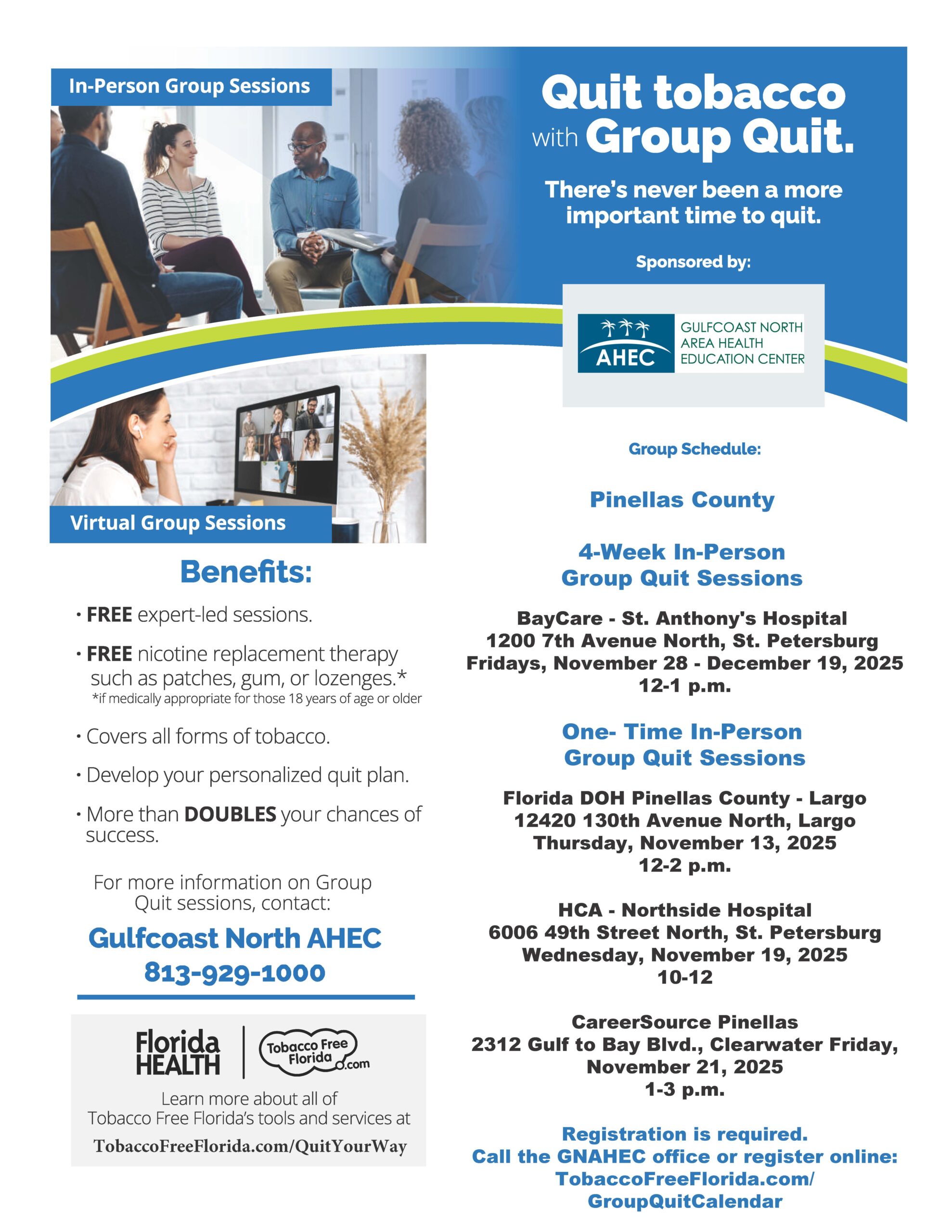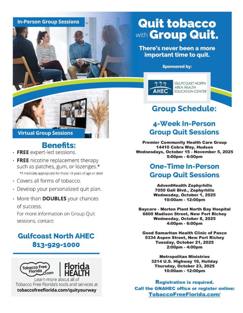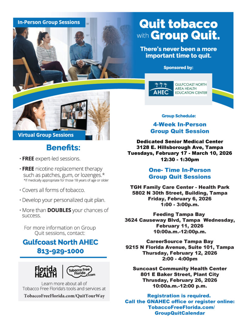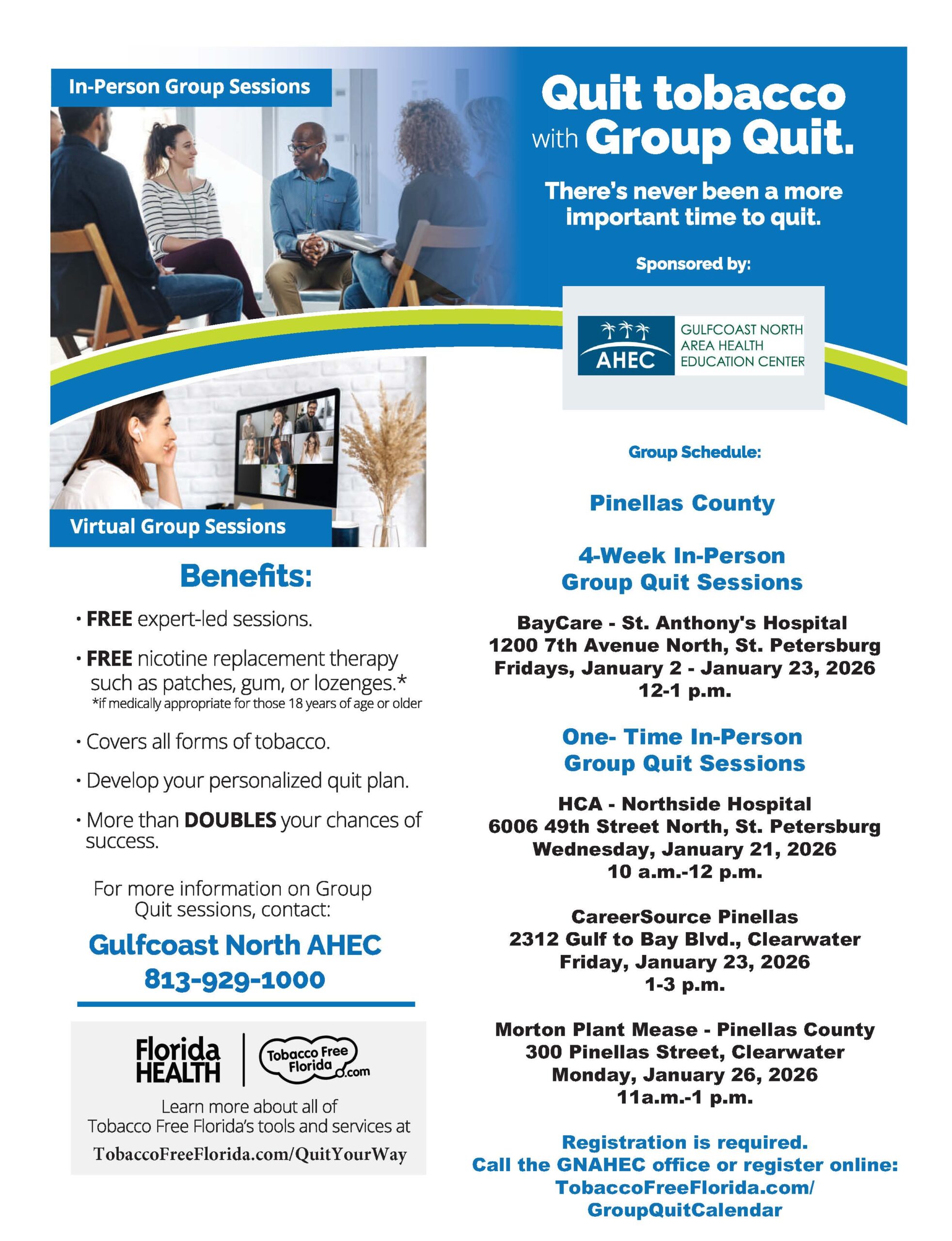 CONNECTING Students to Careers CONNECTING Professionals to Communities CONNECTING Communities to Better Health OUR PROGRAMS Tobacco Cessation AHEC Scholars Youth Programs Clinical Training Continuing Education Community Projects OUR PARTNERS WANT TO QUIT TOBACCO? Please see below for a calendar of available Tobacco Cessation Classes in your area: Group Quit Calendar DOWNLOAD OUR MONTHLY CLASS FLYERS Virtual Classes Spanish Classes In-Person - Hernando In-Person - Pinellas In-Person - Hillsborough In-Person - Pasco In-Person - Citrus CLICK HERE FOR MORE INFORMATION OR CALL US AT 813.929.1000