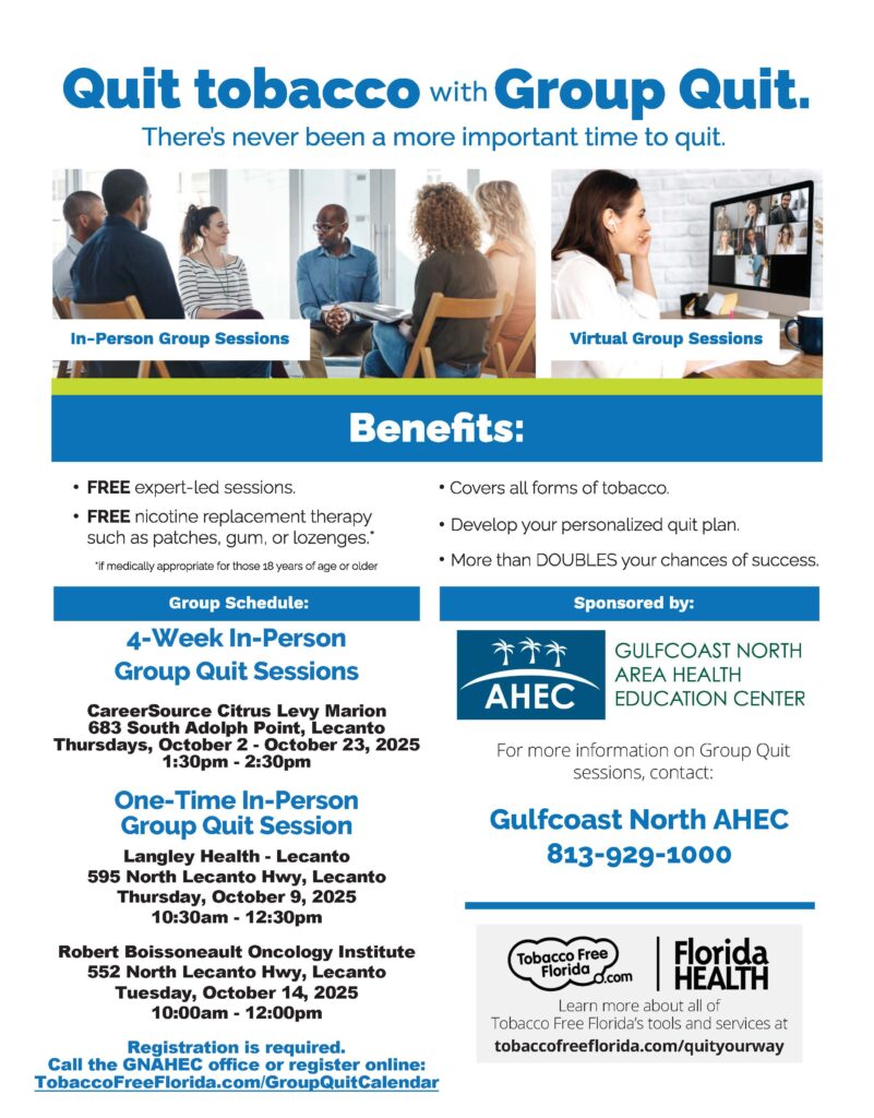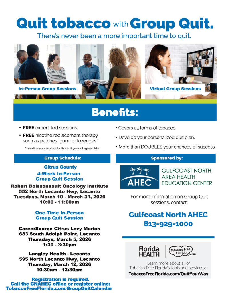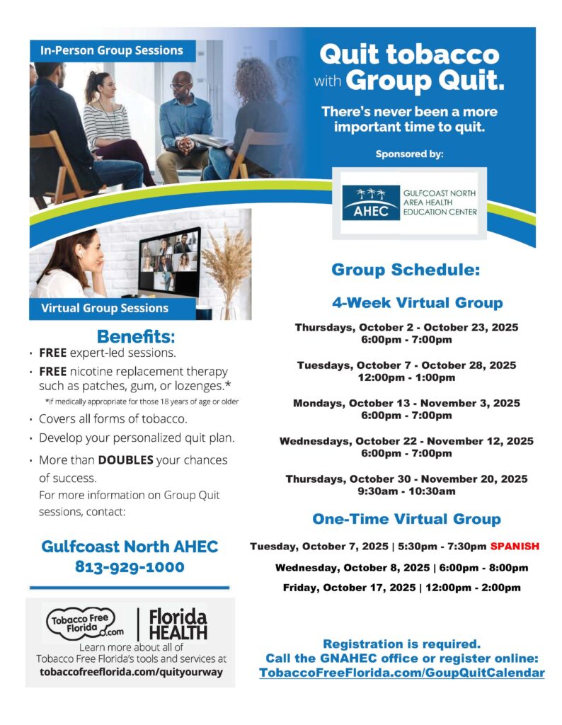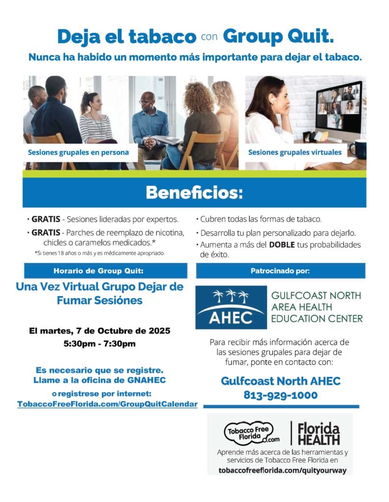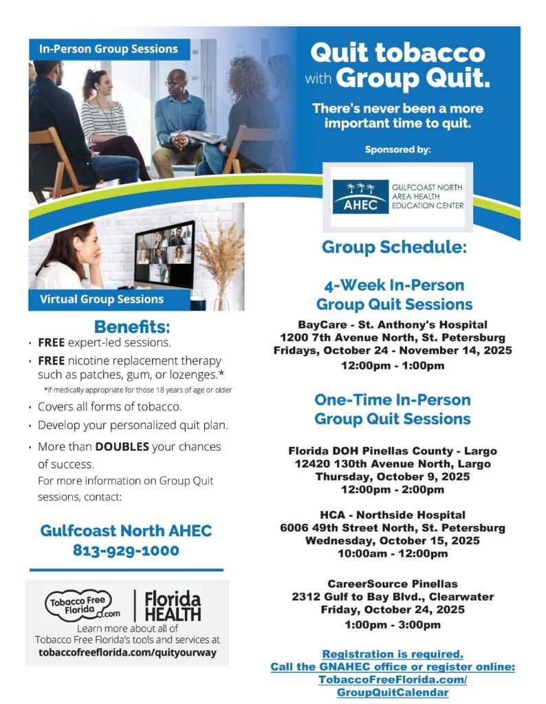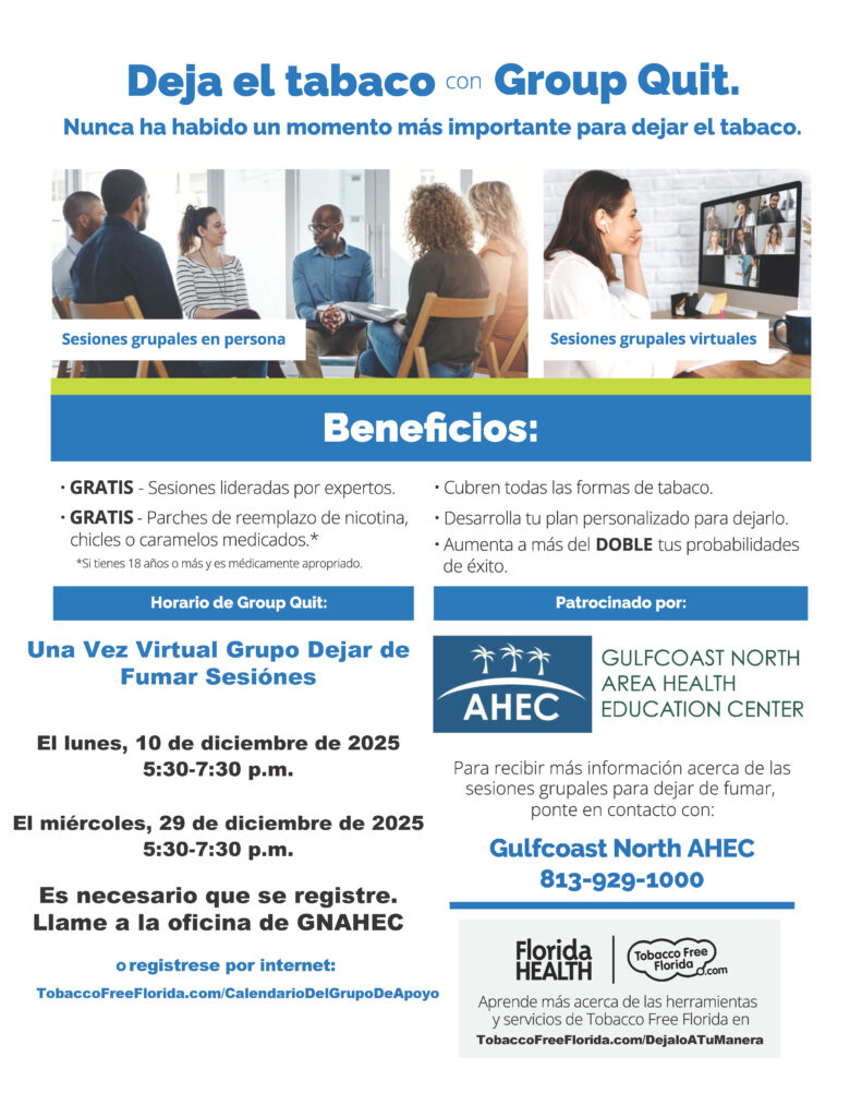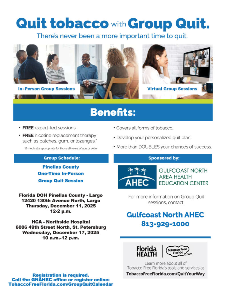 CONNECTING Students to Careers CONNECTING Professionals to Communities CONNECTING Communities to Better Health OUR PROGRAMS Tobacco Cessation AHEC Scholars Youth Programs Clinical Training Continuing Education Community Projects OUR PARTNERS WANT TO QUIT TOBACCO? Please see below for a calendar of available Tobacco Cessation Classes in your area: Group Quit Calendar DOWNLOAD OUR MONTHLY CLASS FLYERS Virtual Classes Spanish Classes In-Person - Hernando In-Person - Pinellas In-Person - Hillsborough In-Person - Pasco In-Person - Citrus CLICK HERE FOR MORE INFORMATION OR CALL US AT 813.929.1000